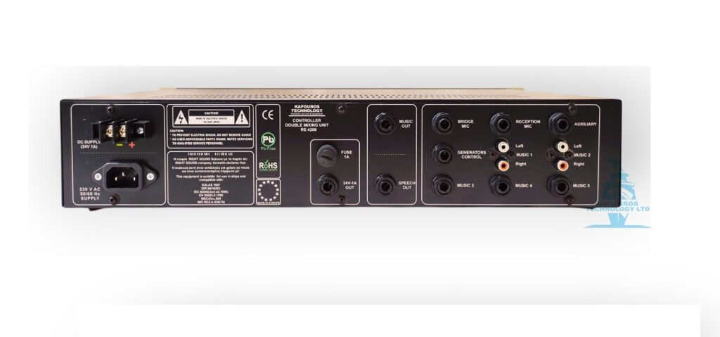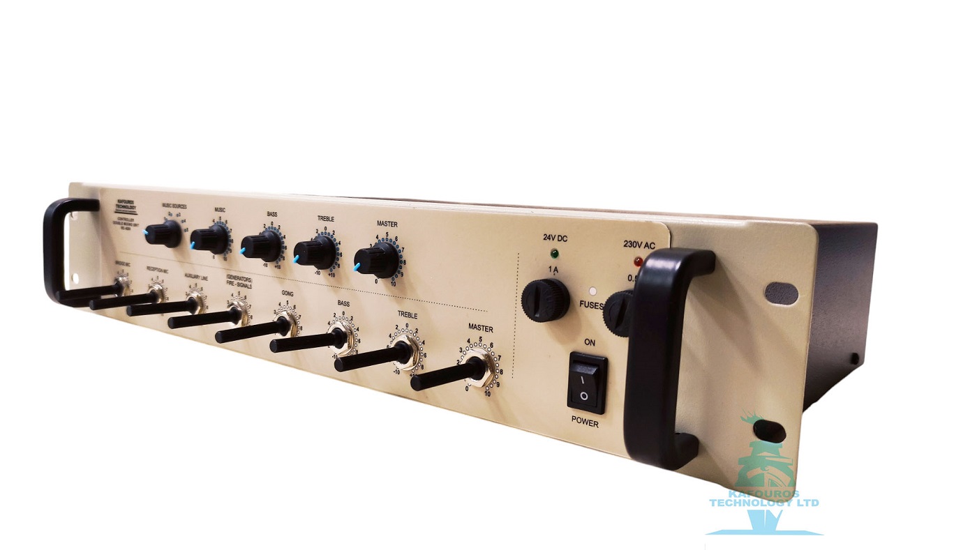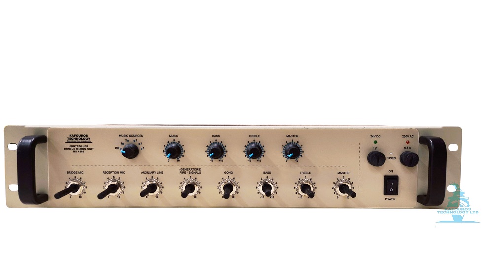 -Διπλός Μίκτης/Προενισχτής με σήματα ενεργοποίησης (Gong) και priorities (Fire Alarm, General Alarm). Σύμφωνος με την οδηγία Ασφαλείας Πλοίων.